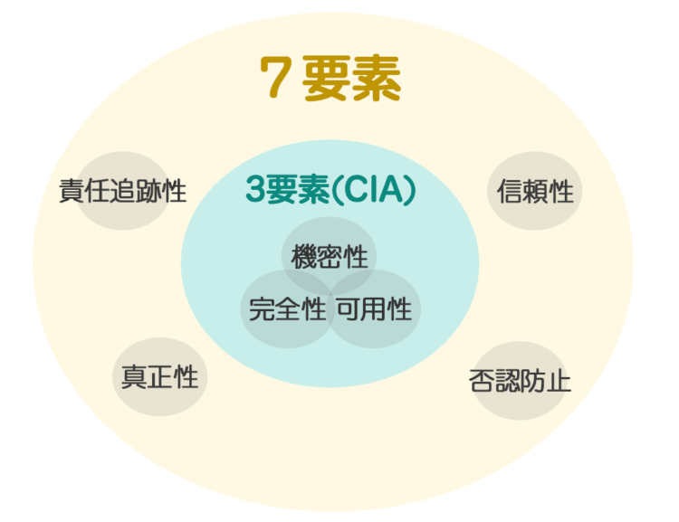 3要素が「基本的な情報保護」を示すのに対し、7要素は「情報やシステムがビジネスにおいてどれだけ信用できるか」という側面まで含めたものです。