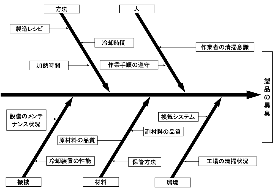 使用例: 製品のサイズが規格外れになった場合、特性要因図を使って、「機械が古い」「作業者の腕が悪い」「材料が良くない」「作り方が間違っている」など、考えられる原因を書き出し、どれがサイズ不良につながっているかを分析します。