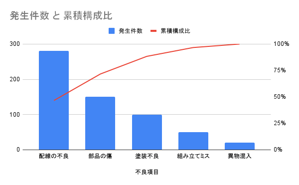パレート図は、複数の問題や不良項目を発生頻度や損失額などの大きさ順に棒グラフで表示し、累積構成比を折れ線グラフで示したものです。これにより、どの問題が最も重要であるかを一目で把握でき、対策の優先順位をつける際に役立ちます。