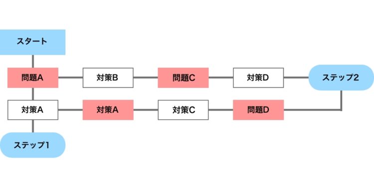 PDPC法(過程決定計画図)は、目標に向かう途中で起こりそうな問題をあらかじめ考え、その対策までを整理しておくための手法です。