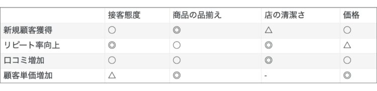 たとえば、「製品ごとの機能」と「お客様の重視するポイント」を表の縦と横に並べ、それぞれの関係を「強い=3、ふつう=2、弱い=1」などの点数で表します。