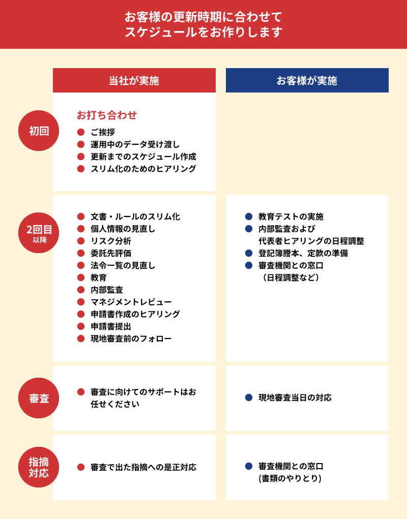 プライバシーマークを新規取得するときは別のコンサル会社さんでお願いしていました。その後、自社運用を行っていたのですが、煩雑さや手間が負担になってしまい悩んでいました。