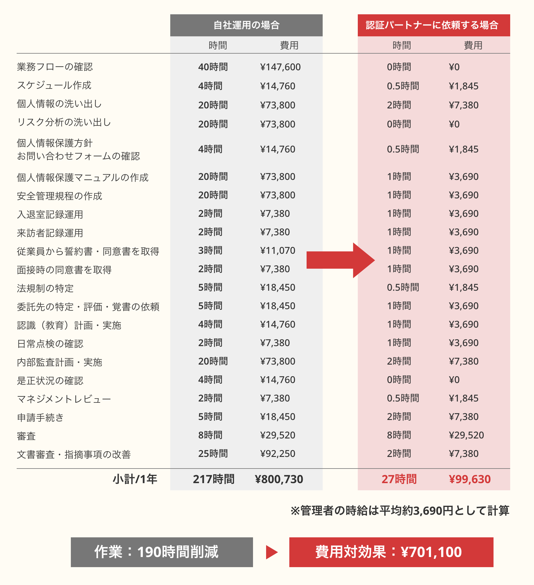 認証パートナーのコンサルタントが御社の事務局メンバーの一員となり、Pマーク(プライバシーマーク)運用・更新に関わる全ての作業をサポート。自社運用の場合約217時間かかる作業を約190時間削減します。