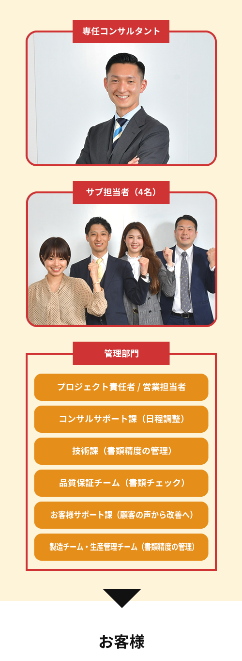 1社に対して専任コンサルタント1名、サブ担当者4名でお客様の情報を共有し、チーム体制でプライバシーマーク(Pマーク)の運用・更新を遂行。チーム体制だからこそ、コンサルタントが打ち合わせなどお客様のご都合に合わせて柔軟に対応することができます。また、管理部門による文書チェック体制により、精度の高い書類を納品しています。