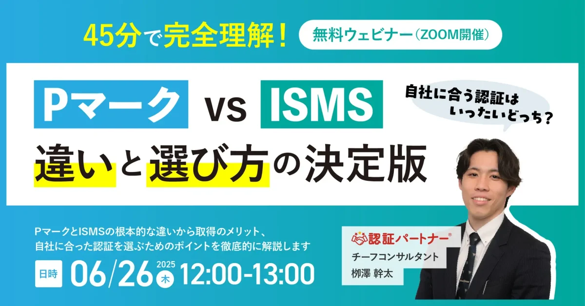 【無料ウェビナー】「45分で完全理解!Pマーク vs ISMS 違いと選び方の決定版」 ― 自社に合う認証はいったいどっち?― 6/26(木)12:00-13:00開催