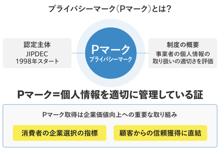 Pマークとは「プライバシーマーク」の略称で、一般財団法人日本情報経済社会推進協会(JIPDEC)が付与する、個人情報を取り扱う仕組みや運用に関する認定制度のマークです。