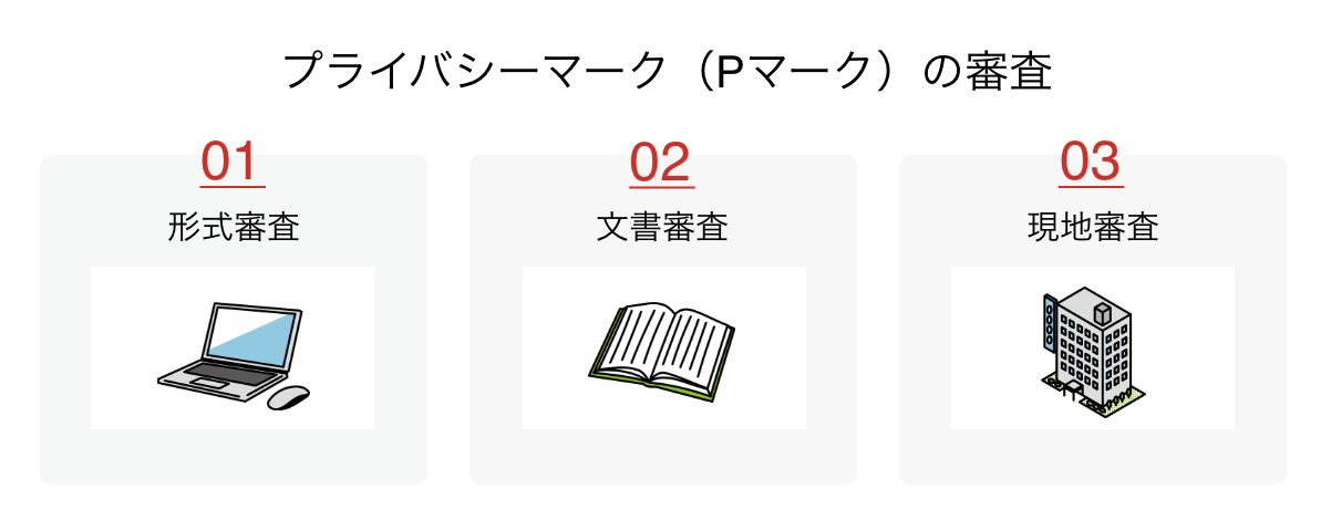 プライバシーマーク(Pマーク)の審査は、『形式審査』『文書審査』『現地審査』の3段階に分かれています。
